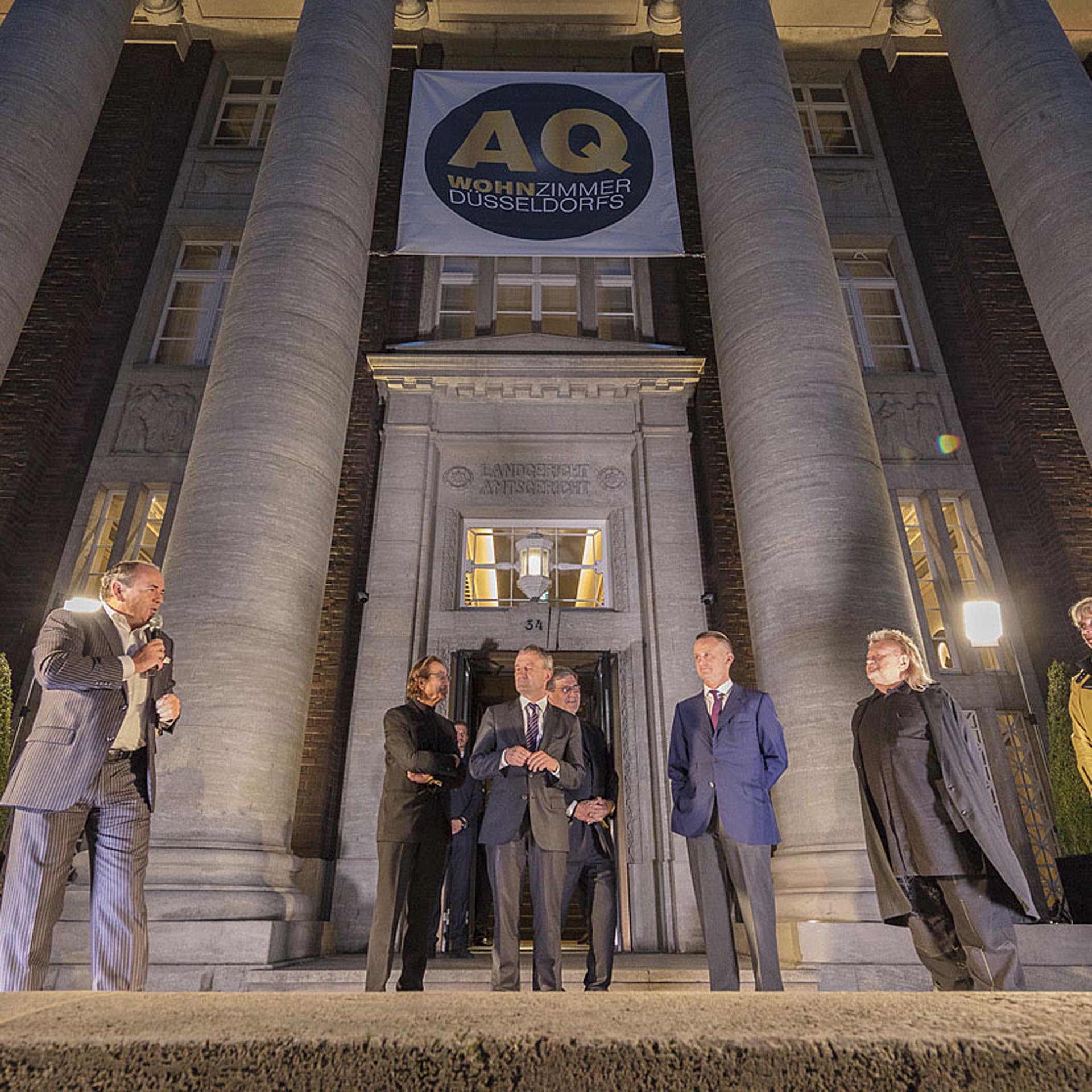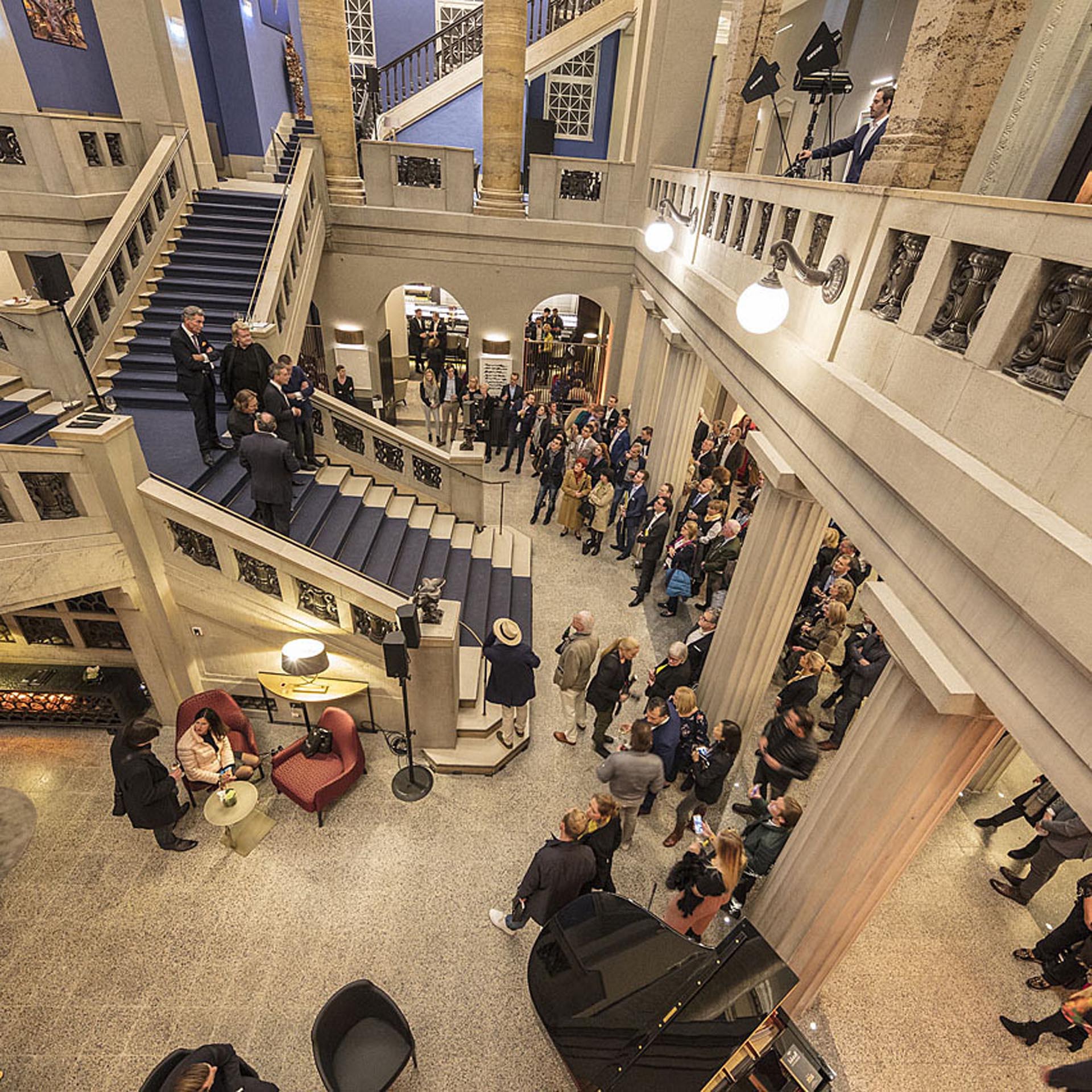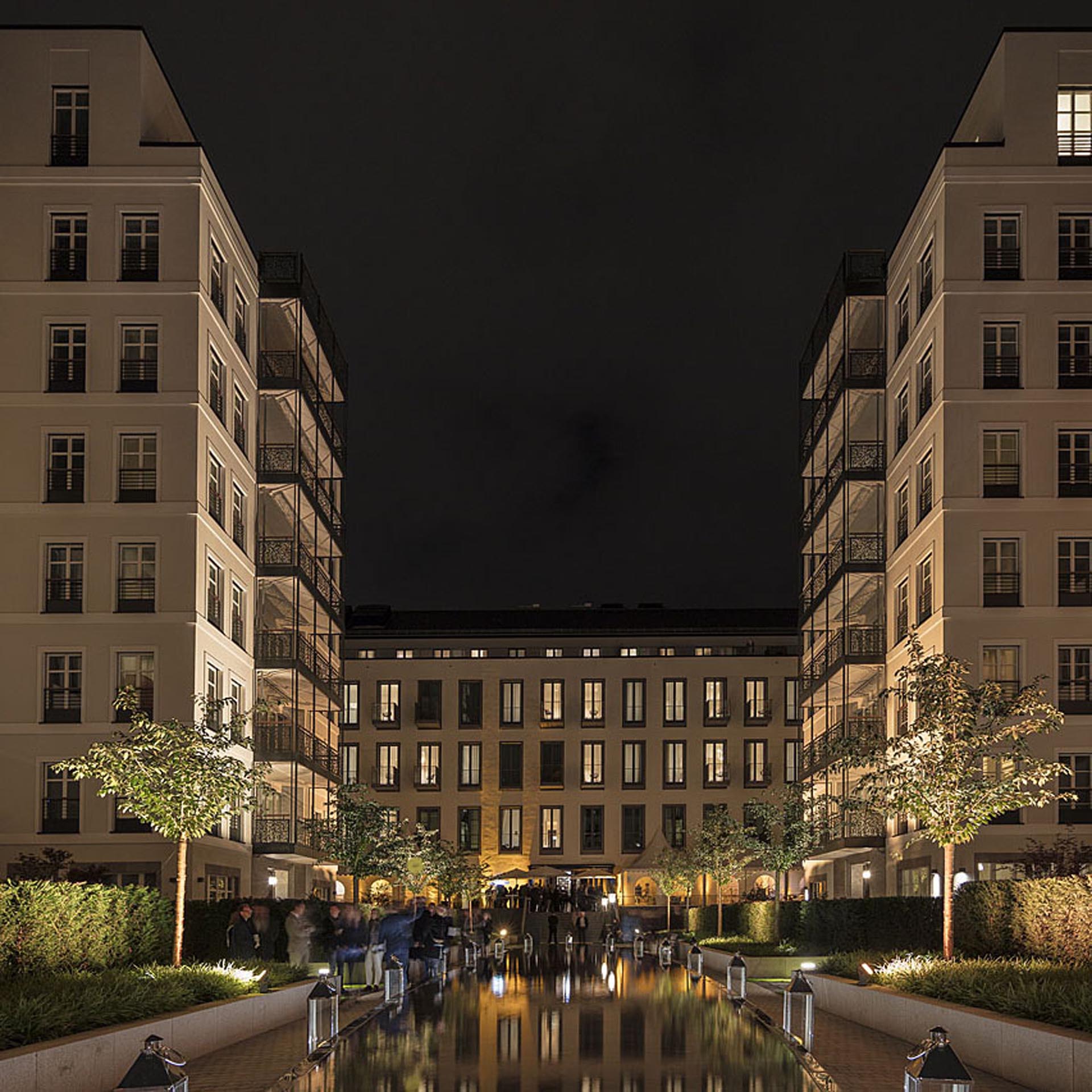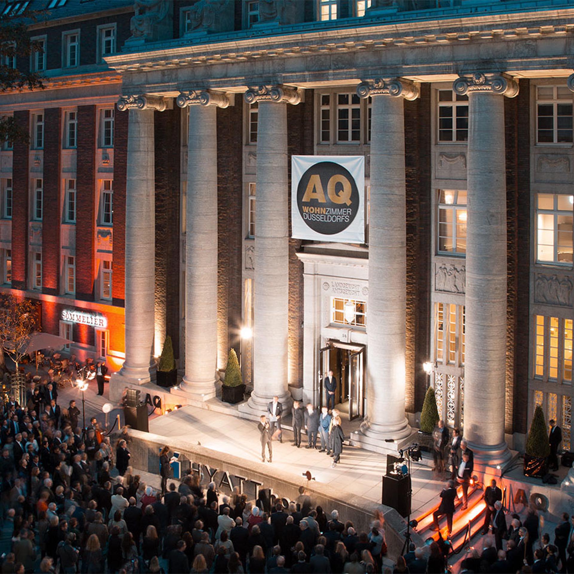 Panoramafotografie der historischen Fassade des Luxushotels The Wellem in Düsseldorf mit monumentalen Säulen, symmetrischer Architektur und klassizistischen Details bei klarem Tageslicht.