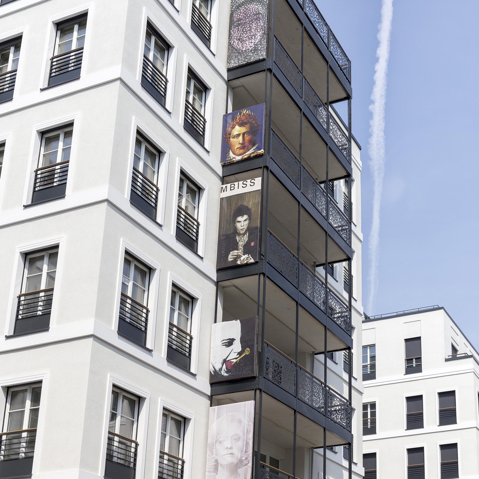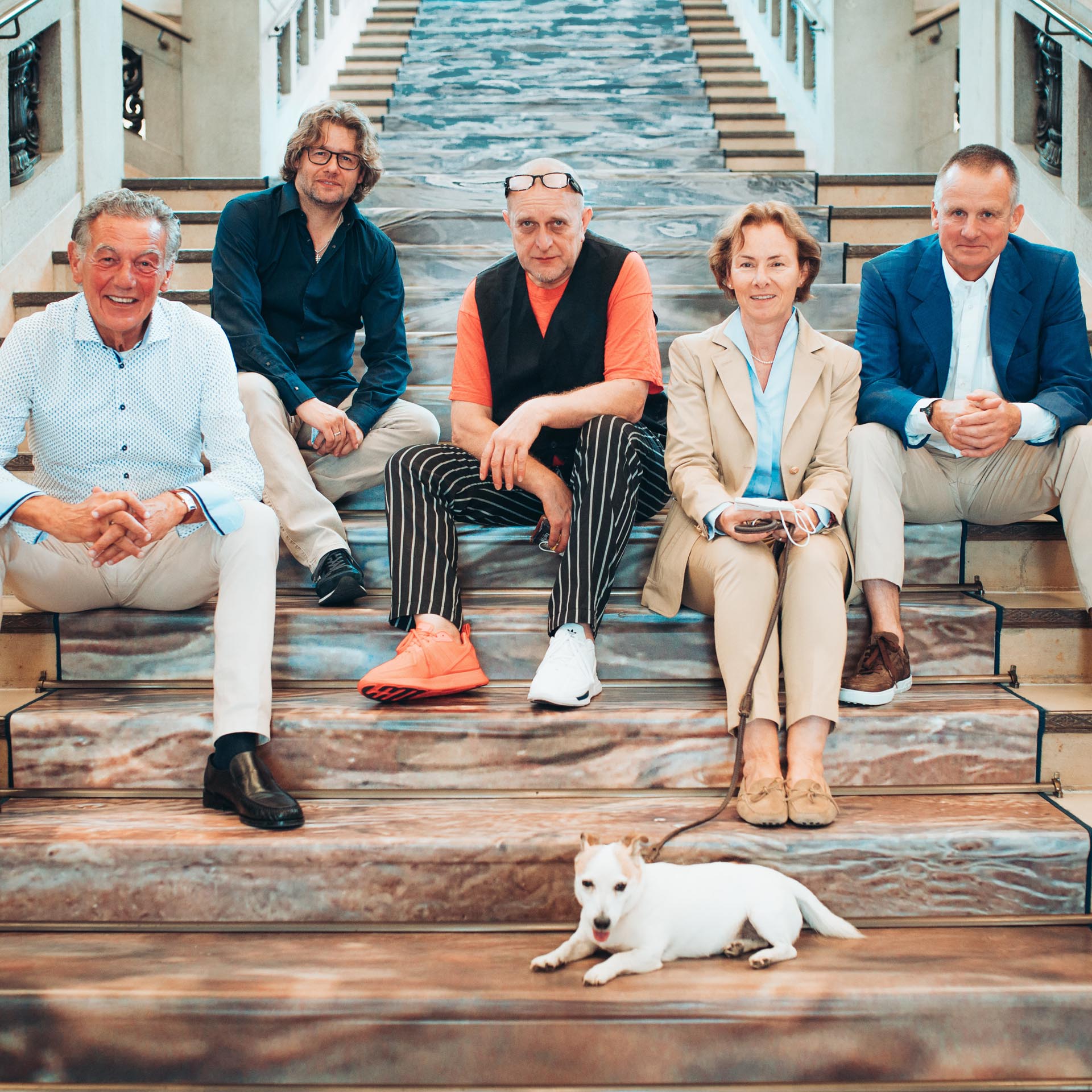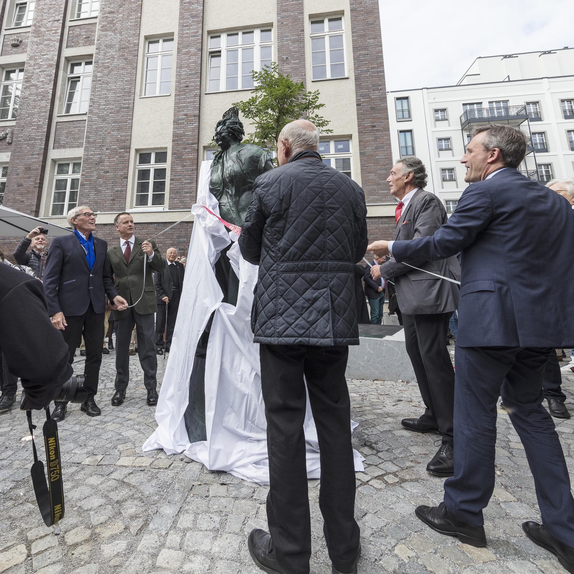 Panoramafotografie der historischen Fassade des Luxushotels The Wellem in Düsseldorf mit monumentalen Säulen, symmetrischer Architektur und klassizistischen Details bei klarem Tageslicht.