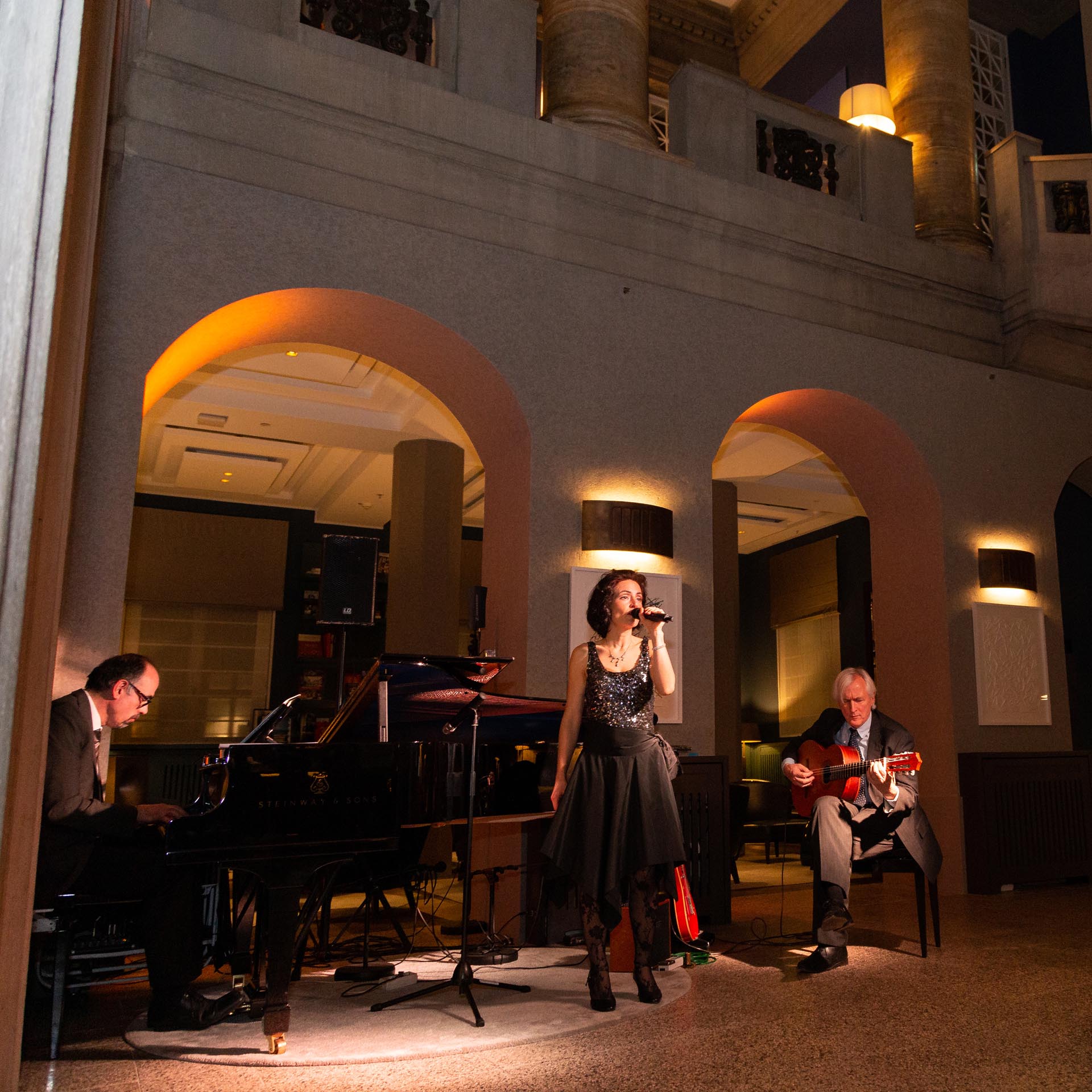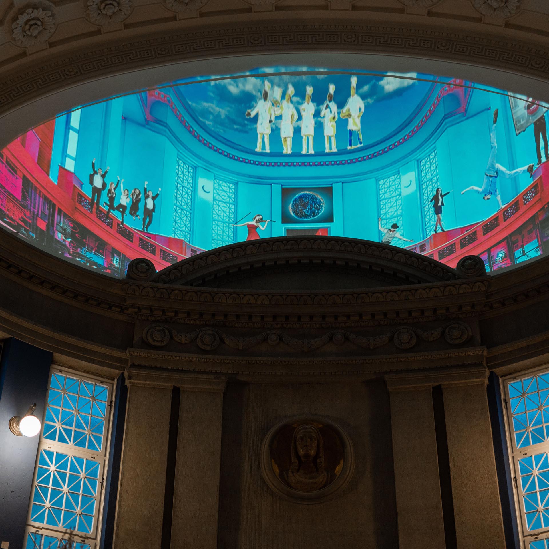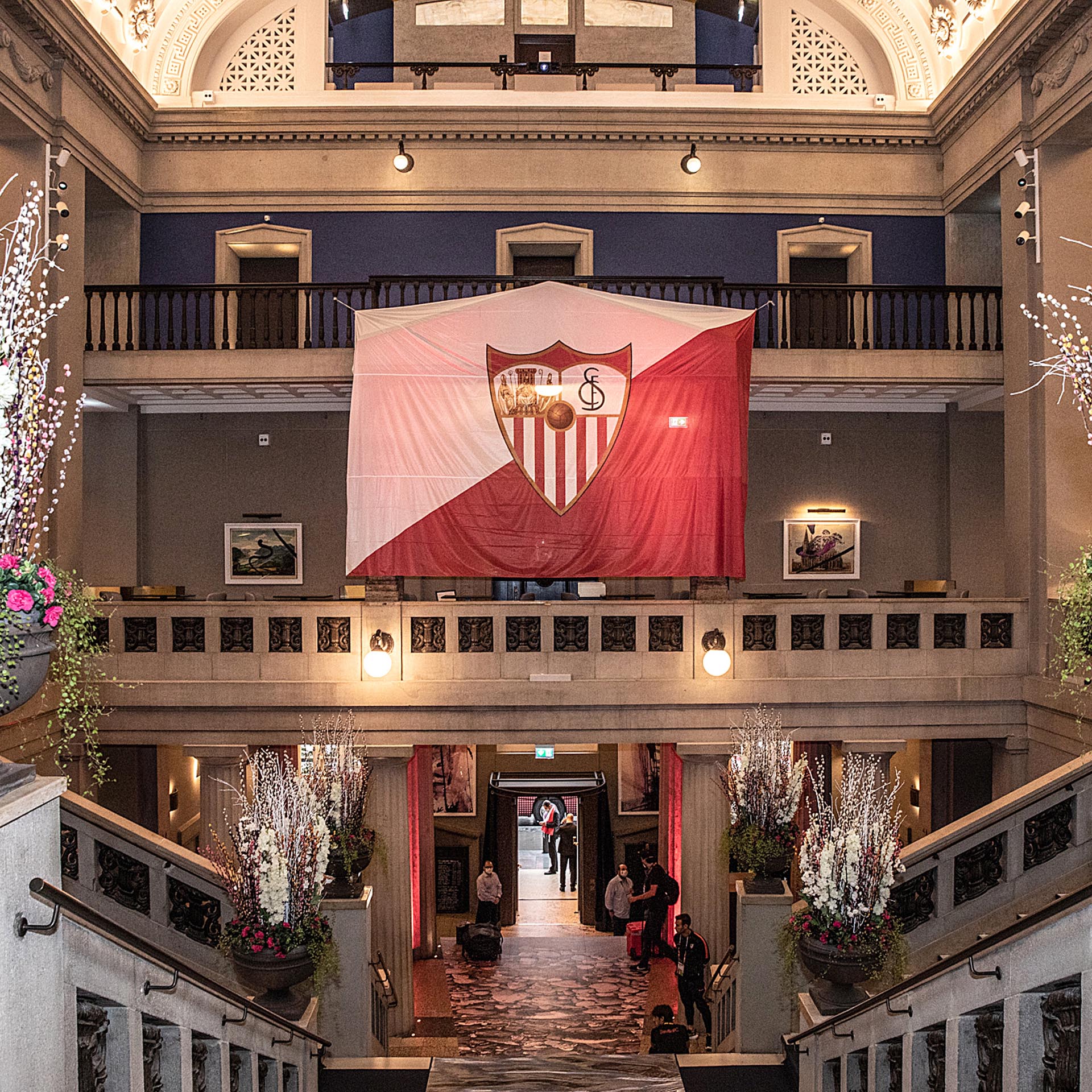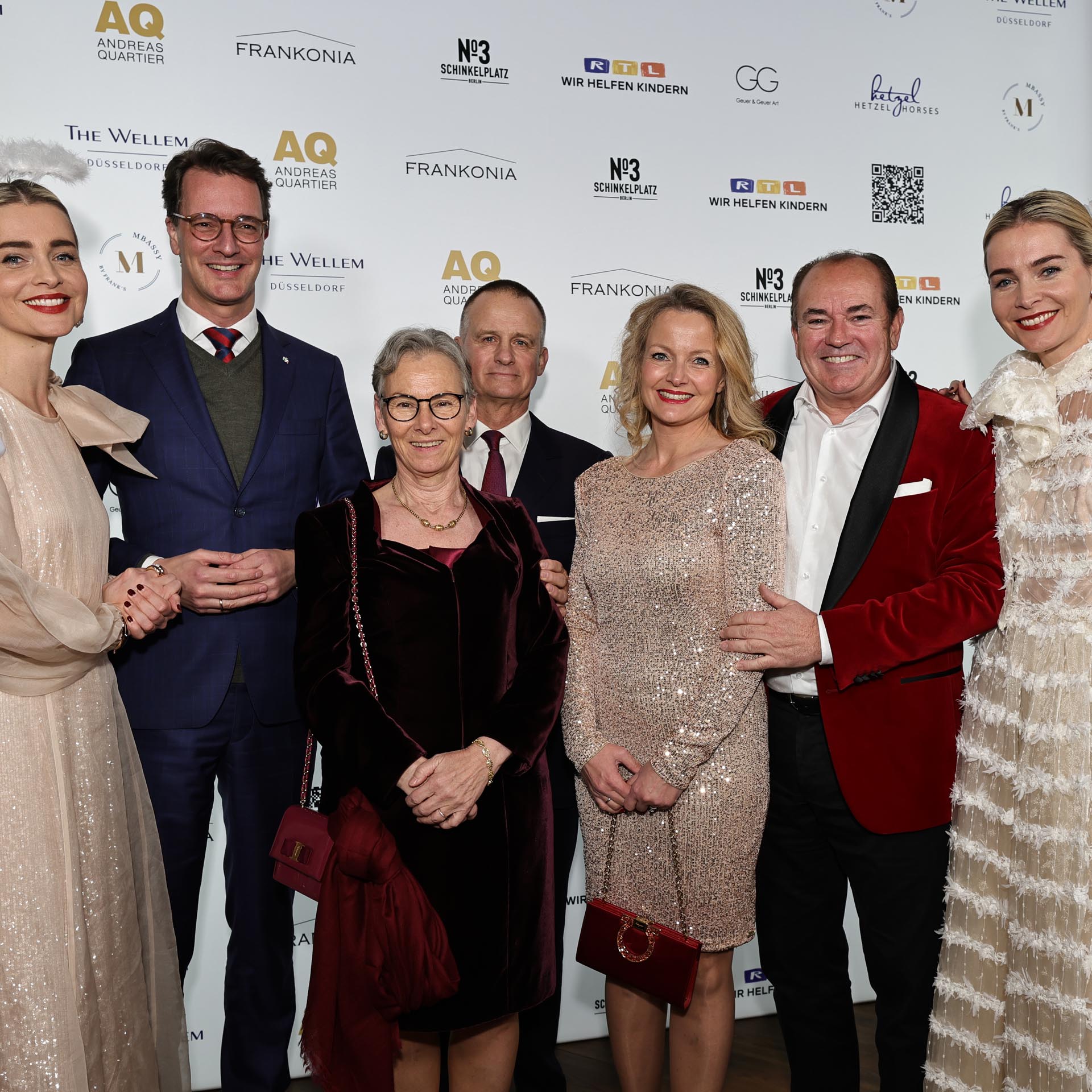 Panoramafotografie der historischen Fassade des Luxushotels The Wellem in Düsseldorf mit monumentalen Säulen, symmetrischer Architektur und klassizistischen Details bei klarem Tageslicht.